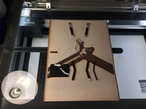 I opened up F360, Then opened the model and switched over to drawing mode. Change the angle/look I wanted then exported that out as a PDF. Opened another tab in fusion and create the layout for the wallet. Then dump that out as a DXF. Switched over to AI, imported both assets and played around with it till I got the look/layout I liked. Then colored the layers so they appeared as separate ops in the GFUI. Setup the cuts and engraves- then loaded up the leather.