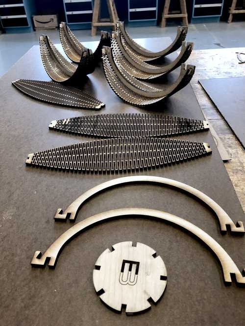 I used Fusion 360 to model all the parts even creating a parametric lattice hinge pattern along the sphere flat patterns. I used .18" Birch plywood from Lowes (Cut settings: 160/Full Power… ENGRAVE: Full Speed/Power 80). If your anything like me, I have yet to have a good experience with any lumber from Lowes, so I would recommend using better quality wood and would welcome any recommendations. I am pretty happy with the way the lattice pattern diffuses the light.